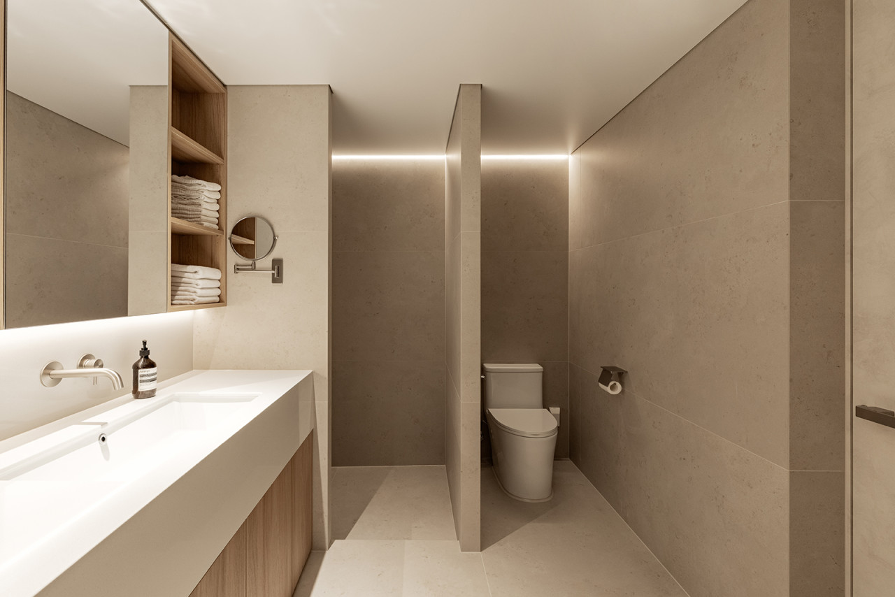 조적파티션을 활용해 매립수전을 설치하는 경우도 있습니다. 편의와 동선에 맞춰 세면과 샤워공간을 분리하여 공간을 구성하면 만족도가 높지요.