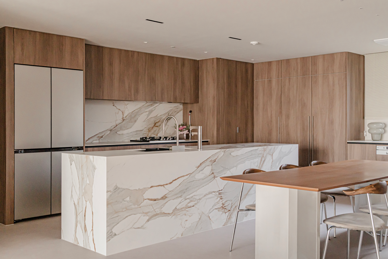 먼저 화이트와 우드 톤을 중심으로 구성된 하이엔드 아일랜드형 주방 인테리어입니다. 세라믹 상판을 적용해 대리석 특유의 질감을 살리면서도 빛 반사를 줄여 차분하고 안정적인 분위기를 연출하고 있어요.